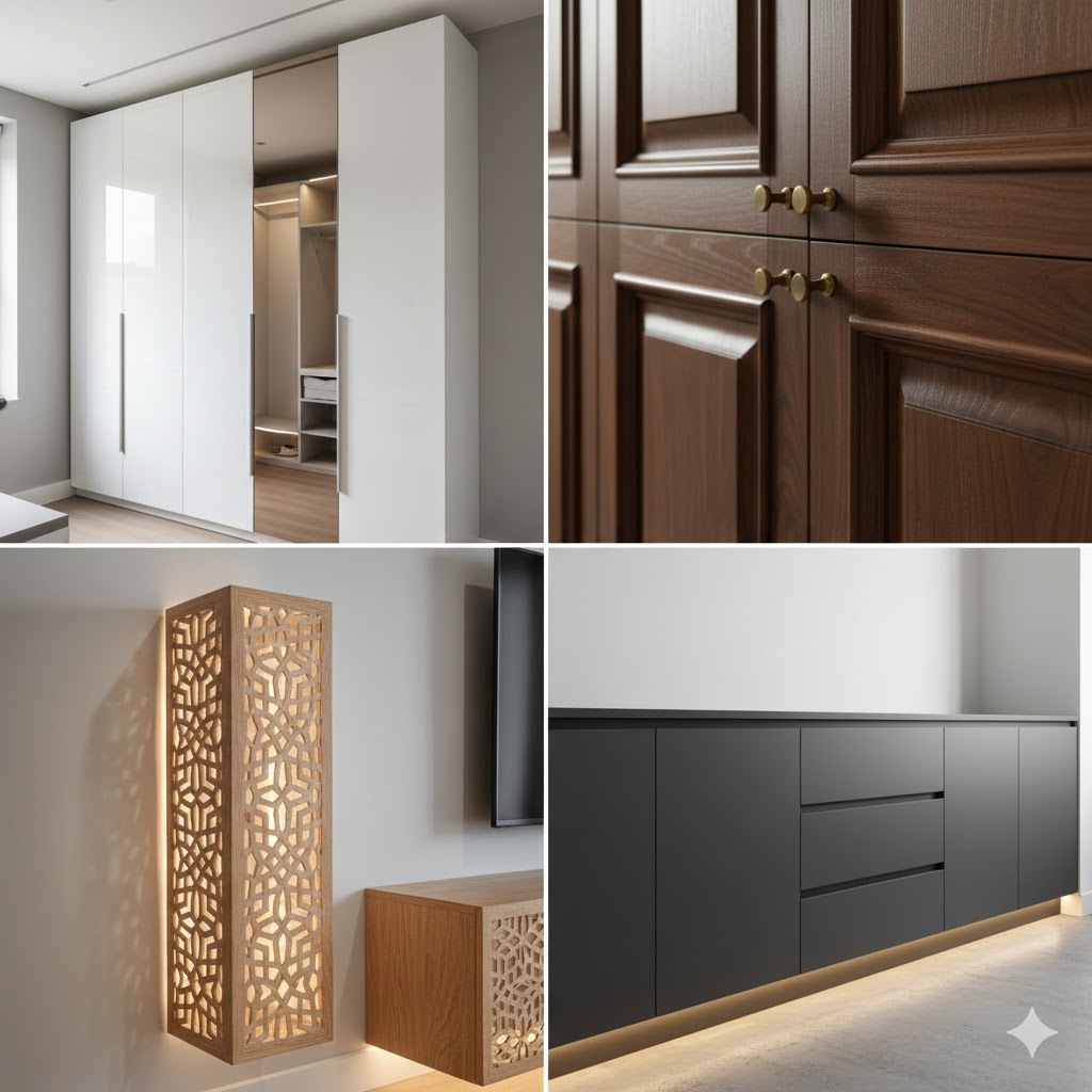Wardrobe Shutters: Custom-sized shutters designed for hinged, sliding, or bi-fold wardrobes, offered in a multitude of materials and finishes to match your interior theme. This includes mirrored, glass-insert, or CNC-carved options.